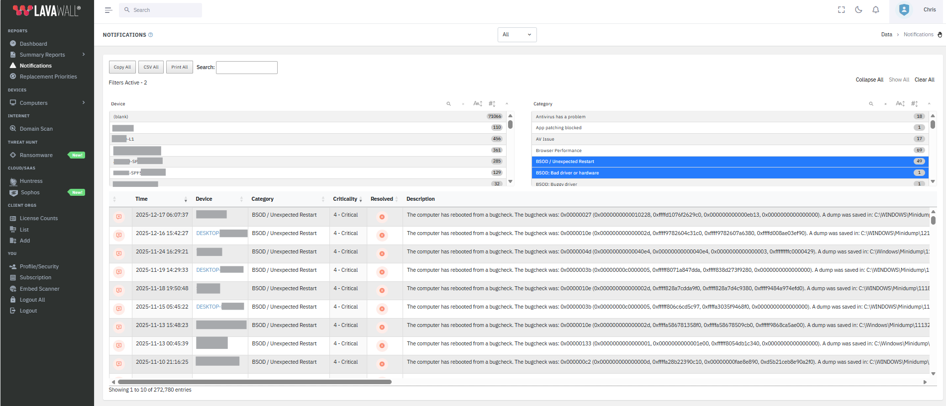 Best of all, you’ll get notifications for BSOD and other events that affect your clients, so you can demonstrate great support by reaching out to them to solve the problem instead of them being frustrated in silence or filling your ticket logs with low CSAT scores.