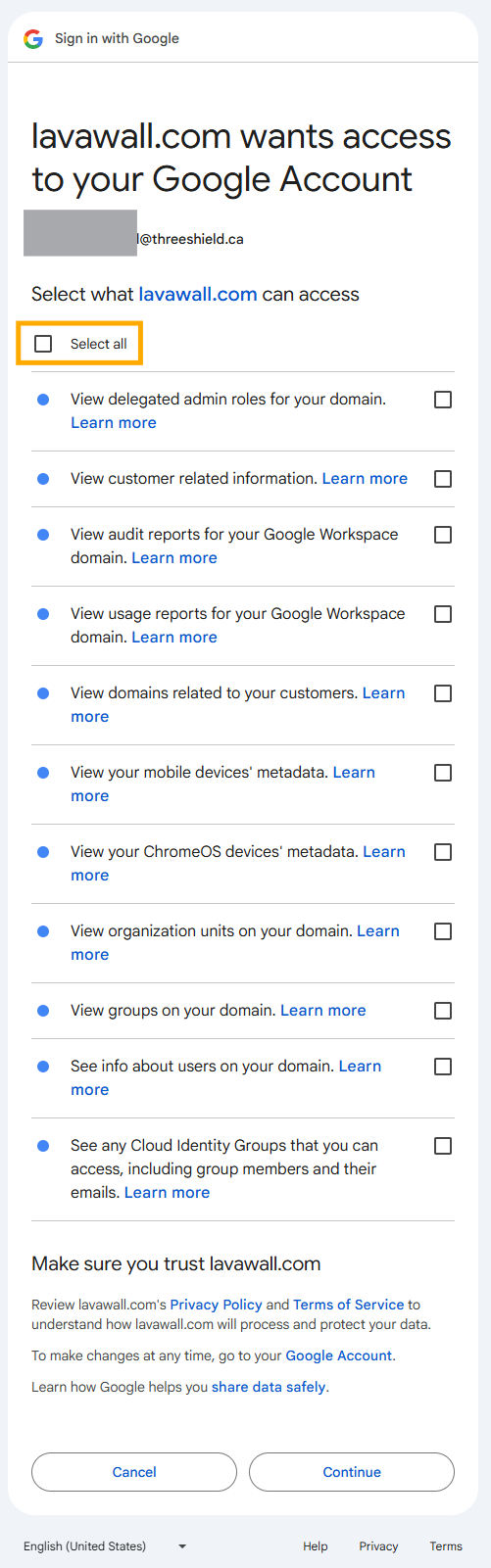 - Click the box beside Select all to select the permissions that Lavawall® requires to monitor your security.