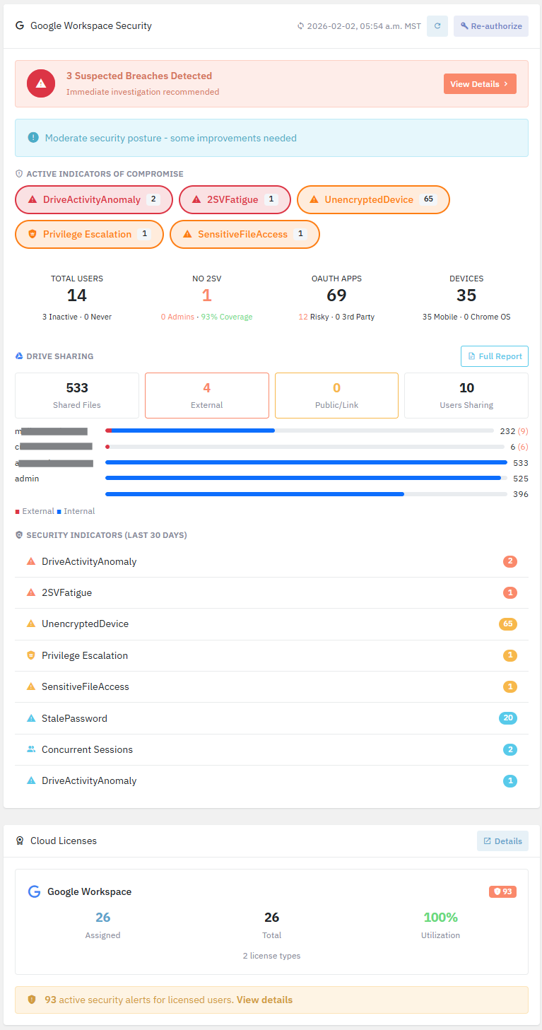 Within a couple minutes, Lavawall® automatically puts together the data that Google has available to identify suspected breaches and security risks.It also identifies easy wins to secure your environment, like unencrypted devices, users without two-step verification, inactive users, and apps that might be used to steal your sensitive information.